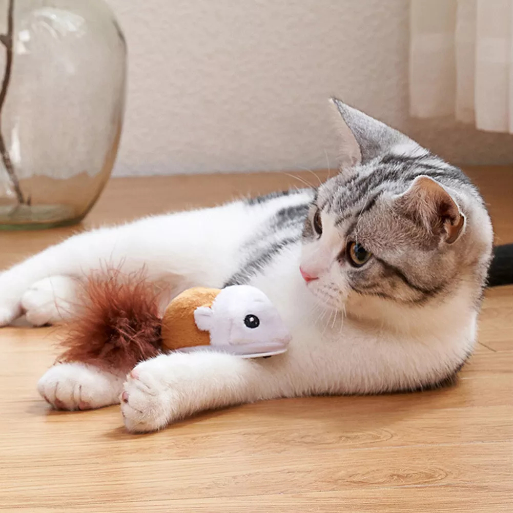 Vivid mouse shape, with fur tail, attract cat’s interest.